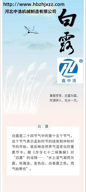 白露時節,鄭國各地大忙時節,一些地區開始收獲穀子、高粱和大豆,一些地開始采摘新棉,西北地區則開始播種冬小麥。而河北中浩依然從事波紋補償器、膨脹節、通風蝶閥、管道連接的製造,專注工藝,創新設計,不斷為客戶提供合適產品而不懈努力和奮鬥。