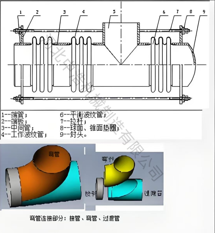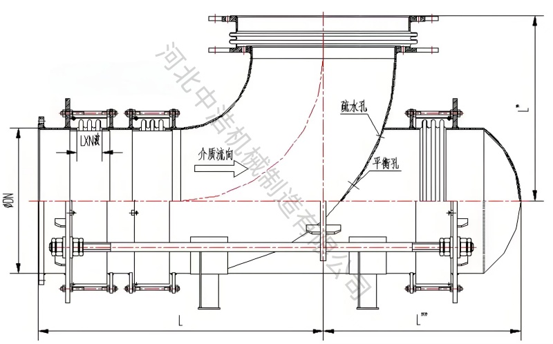 c、拉杆與其他部件約束與平衡:出了波紋管外, 曲管壓力平衡補償器還包括;拉杆、端板、封feng頭tou和he墊dian圈quan等deng,這zhe些xie部bu件jian在zai補bu償chang器qi工gong作zuo中zhong起qi到dao約yue束shu和he平ping衡heng作zuo用yong。其qi中zhong,拉la杆gan可ke以yi約yue束shu波bo紋wen管guan運yun動dong範fan圍wei,防fang止zhi過guo度du拉la伸shen,而er封feng頭tou又you包bao括kuo端duan板ban、球麵和錐麵墊圈等起到傳遞熱位移平衡壓力和推力作用。