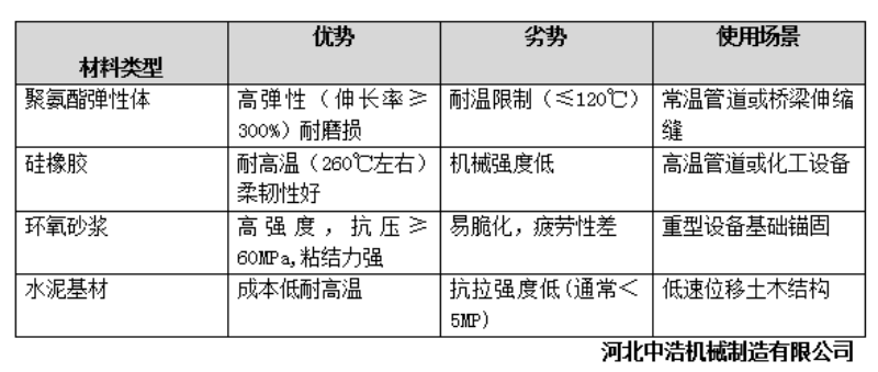 力學性能主要體現在彈性模量和抗拉抗壓強度以及斷裂韌性,低彈性材料柔韌性好可適應_大位移變形,減少應力集中,高彈性材料(如混凝土)易因剛性過渡而開裂。抗拉抗壓強度高強度材料如(環氧樹脂)可ke承cheng受shou更geng大da載zai荷he和he頻pin繁fan位wei移yi,使shi用yong壽shou命ming長chang。而er低di強qiang度du材cai料liao易yi在zai動dong態tai載zai荷he下xia疲pi勞lao損sun壞huai。針zhen對dui斷duan裂lie韌ren性xing問wen題ti,可ke用yong高gao韌ren型xing材cai料liao,可ke抑yi製zhi微wei小xiao裂lie紋wen引yin起qi的de斷duan裂lie。從cong耐nai久jiu性xing考kao慮lv高gao溫wen環huan境jing載zai300℃以yi上shang可ke選xuan用yong矽gui酮tong膠jiao等deng耐nai溫wen材cai料liao,普pu通tong材cai料liao極ji易yi發fa生sheng脆cui化hua。考kao慮lv耐nai化hua學xue腐fu蝕shi化hua工gong廠chang環huan境jing需xu要yao抗kang酸suan堿jian材cai料liao,例li如ru氟fu橡xiang膠jiao,避bi免mian腐fu蝕shi失shi去qu密mi封feng性xing。而er耐nai腐fu性xing需xu要yao選xuan擇ze對dui紫zi外wai線xian敏min感gan材cai料liao如ru(聚氨酯)添加抗老劑,避免使用開裂現象。考慮界麵強度和搜索率,如低粘性材料(如普通水泥砂漿)極易與金屬基體脫粘,導致滲漏。而高收縮材料(如固化環氧樹脂)可ke能neng因yin收shou縮suo應ying力li引yin發fa斷duan裂lie,需xu要yao添tian加jia膨peng脹zhang劑ji。從cong膨peng脹zhang係xi數shu考kao慮lv,不bu同tong材cai質zhi不bu同tong。從cong施shi工gong適shi應ying性xing考kao慮lv流liu動dong性xing和he固gu化hua時shi間jian,狹xia窄zhai縫feng隙xi需xu高gao流liu動dong材cai料liao,可ke用yong自zi流liu平ping聚ju合he物wu,確que使shi填tian充chong緊jin密mi。從cong固gu化hua時shi間jian考kao慮lv,如ru果guo搶qiang修xiu時shi間jian短duan可ke用yong雙shuang組zu分fen聚ju氨an酯zhi,凝ning聚ju時shi間jian_短。但需要控製施工進度。一般情形可參照材料對比表: