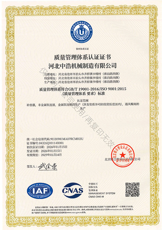 中浩機械質量管理體係認證證書中文-河北中浩機械製造有限公司